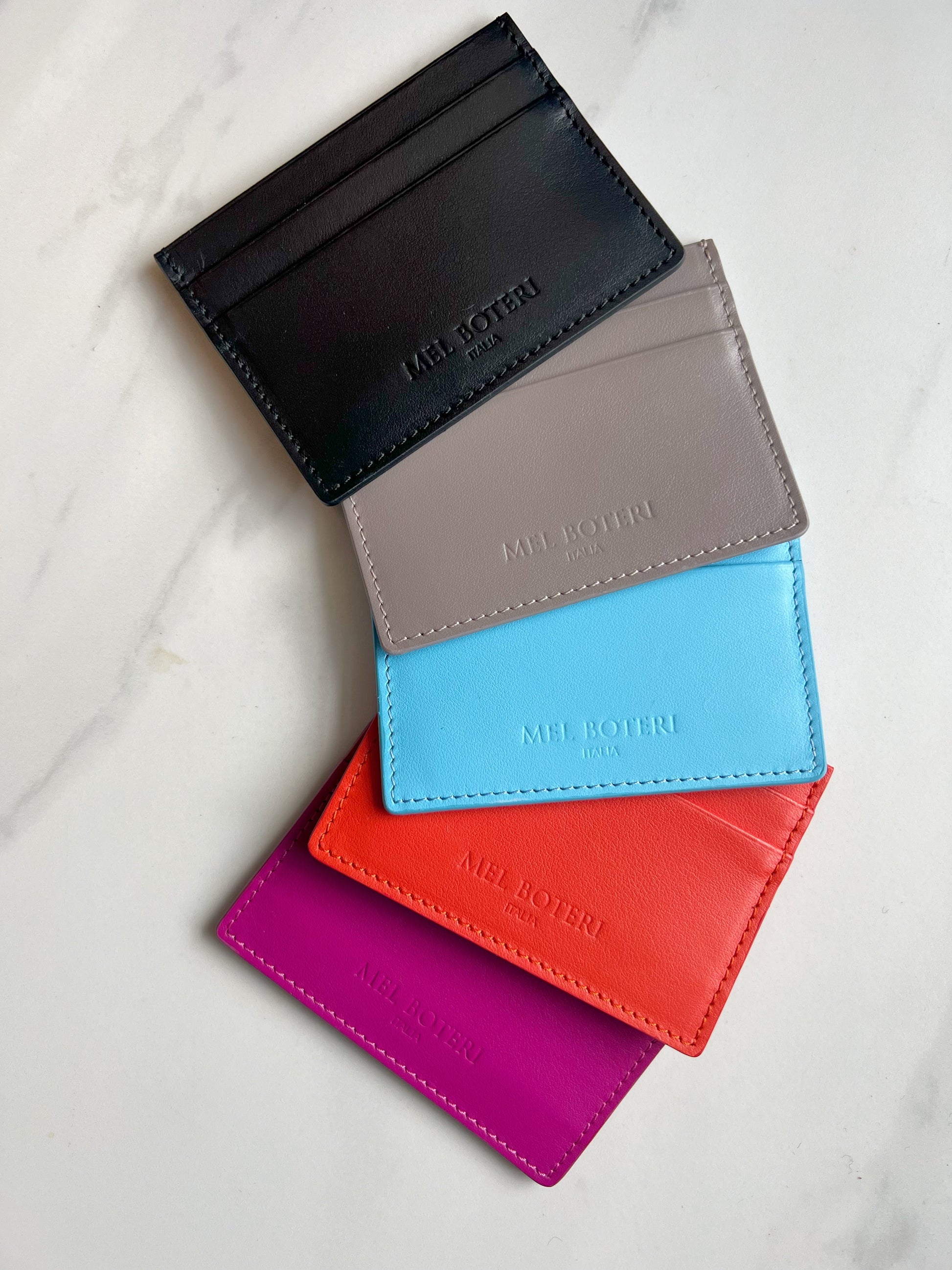 The Mel Boteri slim card holder is a sleek alternative to a bulky wallet. Handcrafted in Milan, Italy, it has five card slots for easy access to your most used cards plus a center compartment to store cash.